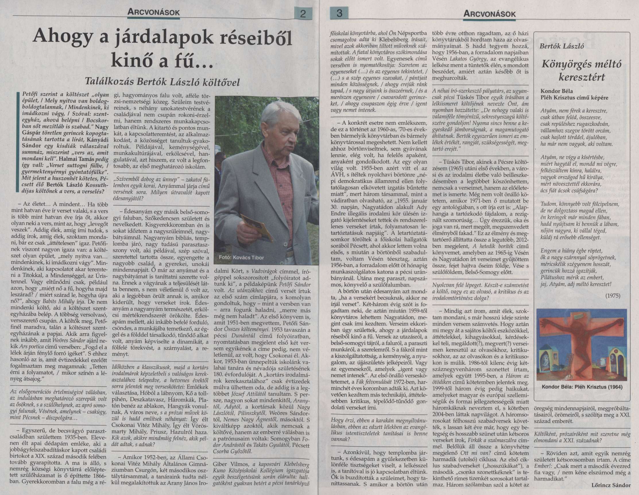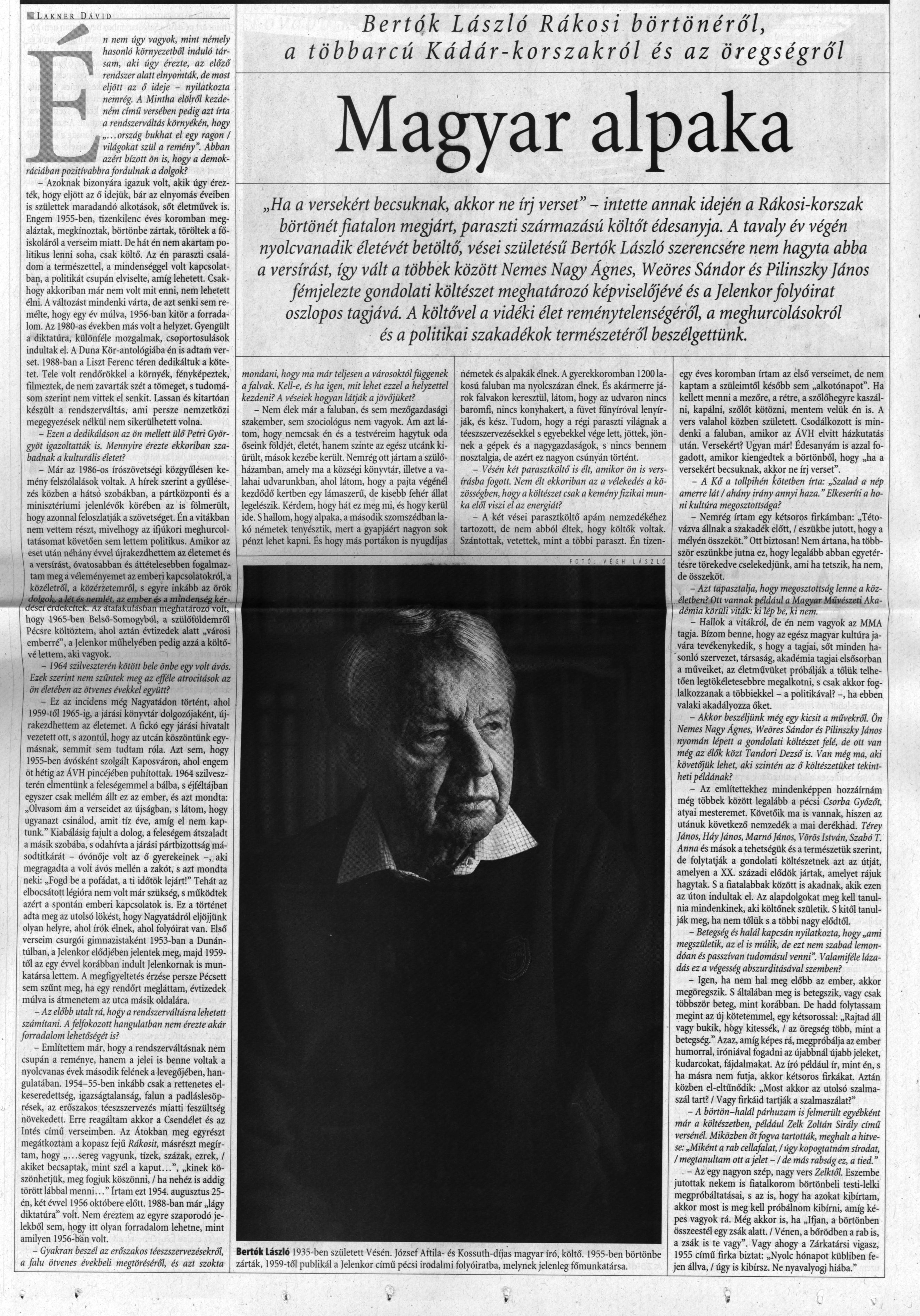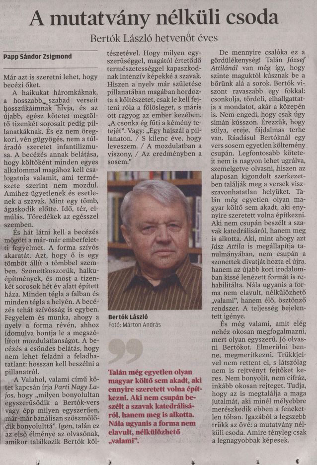 Bedecs László: A szonettig és tovább : Bertók László költészete. – Budapest : L'Harmattan : Könyvpont K., 2024. (PC 10953) Bertók László: Hazulról haza : Ősök, műhelyek, élet / Bertók László. – Pécs : Pro Pannonia Alapítvány, 2005. Bertók László: Priusz. – 2. bőv kiad.. – Budapest : Magvető, 2016. (PB 11 881) Bertók László: Visszanéző : Írók, alkalmak, élet. – Pécs : Pro Pannonia, 2017. – p. 189-196. (PB 11 977) Bicsérdi Nemzetközi Művésztelep 25 éve. – Bicsérd : Bicsérdi Művésztelep : Bicsérd Község Önkormányzata, 2017. – p. 67. : ill. (PC 10 131) A Ciszterci Rend Pécsi Nagy Lajos Gimnáziumának és Kollégiumának évkönyve a 2013/2014. iskolai évről. – Pécs : Ciszterci Rend Nagy Lajos Gimnáziuma, 2014. – p. 177-180. : ill. Értelmiségi karriertörténetek, kapcsolathálók, írócsoportosulások 2. / szerk. Biró Annamária, Boka László. – Nagyvárad : Europrint, 2017. – p. 297-305. Halmai Tamás: Hűség a változáshoz : Bertók László költői világa. – Budapest : Iku, 2019. Íróportrék II. / szerk. Thimár Attila. – Budapest : Szépirodalmi Figyelő, 2008. – p.17-28. (PB 10100) Ki kicsoda Baranya megye könyvtáraiban? / összeáll. Surján Miklós. – Pécs : Csorba Győző Megyei Könyvtár, 2002. Ki kicsoda Pécsett? : 1995. – Pécs : Dél-dunántúli Extra Lapkiadó Kft., 1996. Ki kicsoda Pécsett 2000-ben? / szerk. Bencze János. – Pécs : Bar-Zal Kft., 2001. (PC 7100) Ki kicsoda Pécsett 2005-ben? / szerk. Bencze János, Csató Andrea. – Pécs : Pécsi Hírek Lap- és Könyvkiadó Kft., 2005. (PC 7648) Kortárs művészet, Pécs / Aknai Tamás et al.. – Pécs : Alexandra, 2005. – p. 180-181. (PE 680) Köpflerné Szeles Judit: Bertók László bibliográfia. – Kaposvár : Megyei és Városi Könyvtár, 2007. (PC 7849) Lőrincz Sándor: Vései anziksz. – Vése : Községi Önkormányzat, 2019. – p. 50-69, 108-113. : ill. Nagy Imre: Bertók László : beszélgetés és tanulmány. – Pécs : Pro Pannonia, 1995. (PC 6528) Nagy Imre: A második kapu : Bertók László kései lírájáról / Nagy Imre. – Pécs : Kronosz, 2015. (PB 11731) Pécs-baranyai művészek adattára I. / szerk. és feldolg. Molnár G. Judit, Horváth Anita. – Pécs : Pécsi Művészetek Háza, 2000. – CD-ROM (PCR 8) Pécs lexikon / főszerk. Romváry Ferenc. – Pécs : Pécs Lexikon Kulturális Nonprofit Kft., 2010. Talán a kérdezés : Írások Bertók Lászlóról / vál. Ágoston Zoltán. – Pécs : Alexandra, 2005. (PB 9748) Tüskés Tibor: Az exponált idő. – Pécs : Pro Pannonia, 2000. – p. 112-116. (PB 9297) Baranyai Könyvtári Info, 2000.6:11-13. Bárka, 2015.5:66-70. Dunántúli Napló, 1974.11.30:9. : ill. ; 1982.04.03:3. : ill. ; 1982.06.07:6 ; 1987.09.05:10. : ill. ; 1989.08.05:8. : ill. ; Új Dunántúli Napló, 1995.09.02:19. : ill. ; 1999.02.23:4. : ill. ; 2002.10.28:7. : ill. ; 2004.02.21:7. ; 2004.03.19:7. : ill. ; 2005.05.27:9. : ill. ; 2005. 07.15:9. : ill. ; 2005.12.03:17. ; 2010.09.24:5. ; 2010.12.06:9. : ill. ; 2015.12.24:2. : ill. ; 2016.01.26:4. (kitüntetés) ; 2016.12.10:3. : ill. ; 2019.02.20:1, 12. : ill. ; 2020.09.16:1. [nekrológ] ; 2020.09.17:4. : ill. ; 2020.09.23:2. Echo, 2004.2:11-12. ; 2005.3:36. Élet és Irodalom, 2010.12.03:14. ; 2017.07.14:18. ; 2020.09.25:9. [nekrológ + gyászbeszéd] ; 2026.01.16:21. Forrás, 2018.9:129-131. Heti Válasz, 2002.10.11:48-49. : ill. Humán Források, 2004.6.:4-6. Irodalmi Figyelő, 2006.1:92-101. Irodalmi Szemle, 1995.10:12-18. Jelenkor, 1971.11:1041-1044. ; 1982.10:867-873. ; 1993.6:504-510. ; 1995.12:1037-1046. ; 1997.6:596. ; 2005.12:1171-1173. ; 2010.12:1282-1292, 1296-1304. ; 2015.12:1284-1297. ; 2020.10:1019-1021. ; 2020.12:1313-1357. ; 2022.12:1428-1441, 1442-1446. ; 2025.12:1280-1336. Kortárs, 2021.1:66-69. Könyv, Könyvtár, Könyvtáros, 2020.12:27-29. : ill. [nekrológ] Könyvtárvilág, 2020.5. [nekrológ] (letöltés: 2020.11.05.) Közalkalmazott, 1982.6:6. : ill. Magyar Hang, 2020.09.18-24:27. [nekrológ] Magyar Hírlap, 2005.12.06:9. ; 2020.09.16:13. : ill. [nekrológ] Magyar Idők, 2016.12.31:17. Magyar Napló, 1993.08.20:4-8. Magyar Narancs, 2016.11.25.Könyvmelléklet:IV-VI. : ill. ; 2020.10.01:29. : ill. [nekrológ] Magyar Nemzet, 1995.04.08:19. : ill. ; 2016.01.30:19. : ill. Mértékadó, 2014.03.31-04.06:2-3. : ill. Műhely, 1995.5:29-32. : ill. Nagyítás, 2010.04.07:26. Népszabadság, 1988.11.26:15. : ill. ; 1995.12.06:17. ; 2010.12.06:18. : ill. Népszava, 2020.09.16:13. : ill. [nekrológ] Pécsi Campus, 1995.12.07:29. Pécsi Hírek, 2004.04.08:7. : ill. ; 2008.09.02:3. : ill. ; 2020.10.05:5. Pécsi Panoráma, 2004.6:26-27. Premier, 2006. február–március:103. Royal Club Magazin, 2004.4:8. Somogy, 1993.6:21-24. ; 2018.1:94-96. Szépirodalmi Figyelő, 2006.1:97. Új Forrás, 2010.10:56-69. Versmondó, 2017.tél:99-101.